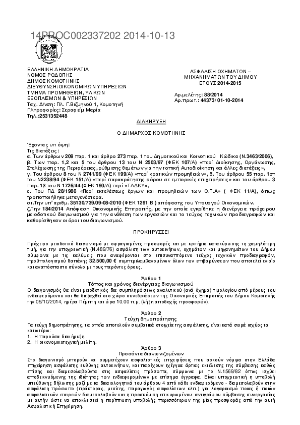 6. ΑΣΦΑΛΙΣΗ ΟΧΗΜΑΤΩΝ – ΜΗΧΑΝΗΜΑΤΩΝ ΤΟΥ ΔΗΜΟΥ ΕΤΟΥΣ 2014-2015