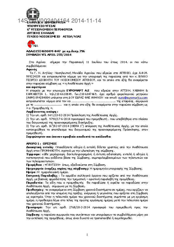 1. ΣΥΜΒΑΣΗ 255/2014 ΓΙΑ ΤΗΝ ΠΡΟΜΗΘΕΙΑ ΓΑΝΤΙΩΝ ΓΙΑ ΤΡΕΙΣ ΜΗΝΕΣ