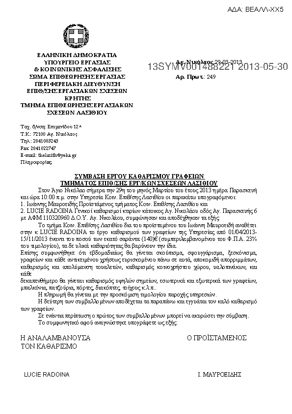 10. ΣΥΜΒΑΣΗ ΕΡΓΟΥ ΚΑΘΑΡΙΣΜΟΥ ΓΡΑΦΕΙΩΝ ΤΜΗΜΑΤΟΣ ΕΠΙΘ/ΣΗΣ ΕΡΓ/ΚΩΝ ΣΧΕΣΕΩΝ ΛΑΣΙΘΙΟΥ
