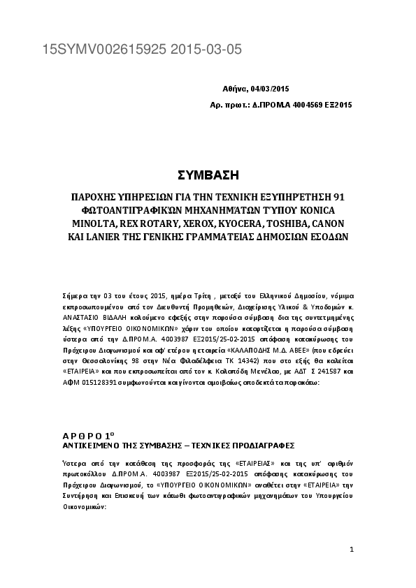 1. ΣΥΜΒΑΣΗ ΑΠΟ ΑΝΑΘΕΣΗ ΕΡΓΟΥ ΚΑΘΑΡΙΟΤΗΤΑΣ Δ.Ο.Υ. ΟΙΚ.ΕΤΟΥΣ 2015.