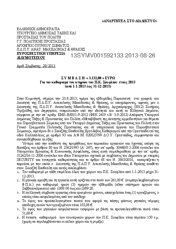 3. ΣΥΜΒΑΣΗ 3.132,00 ευρώ για τον καθαρισμό του κτηρίου του Π/Κ Σουφλίου της Π.Υ. Διδυμοτείχου έτος 2013