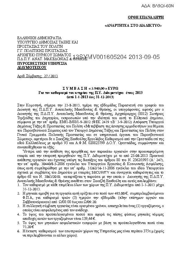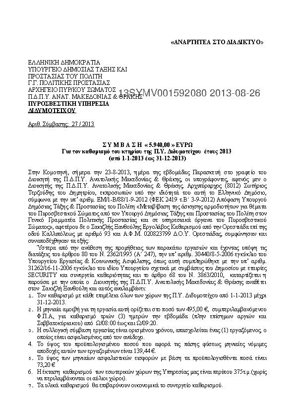 6. Σύμβαση 5.940,00 ευρώ για τον καθαρισμό του κτιρίου της Π.Υ Διδυμοτείχου 2013
