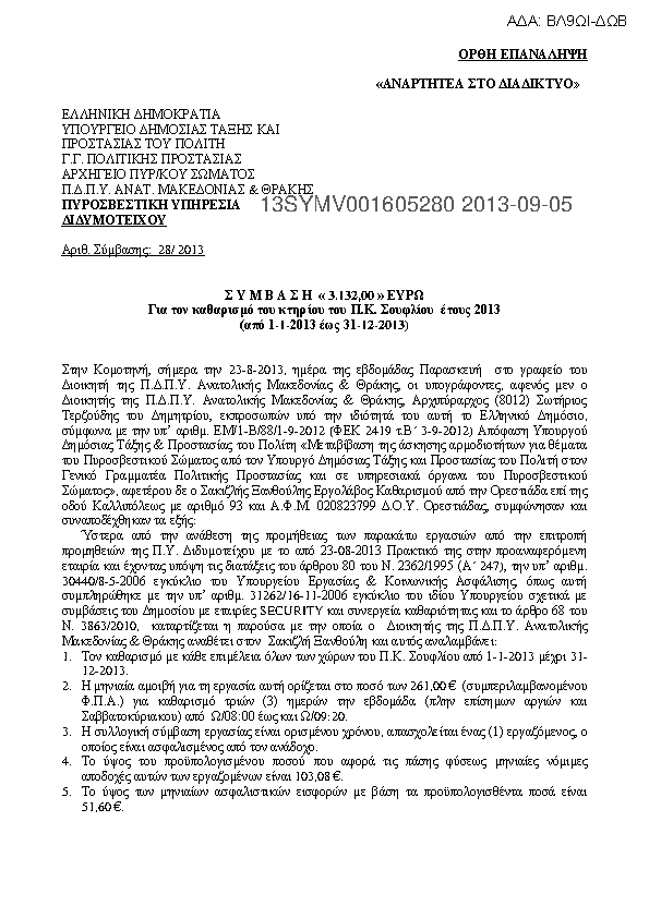 5. ΣΥΜΒΑΣΗ 3.132,00 ευρώ για τον καθαρισμό του κτηρίου του Π/Κ Σουφλίου της Π.Υ. Διδυμοτείχου έτος 2013