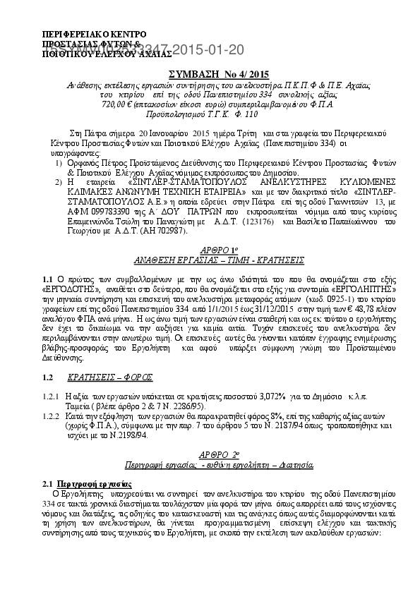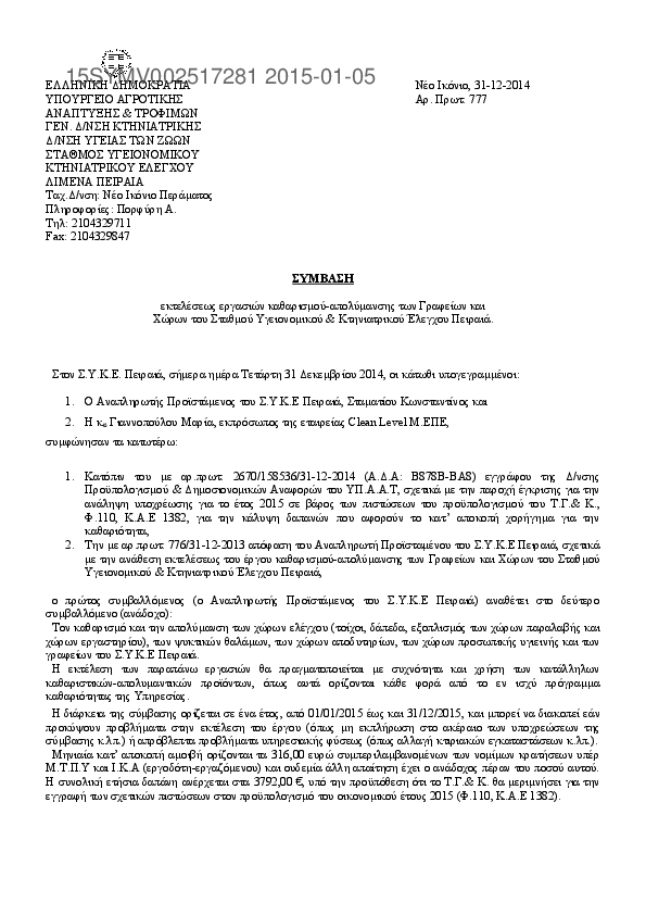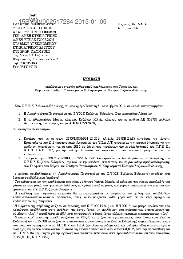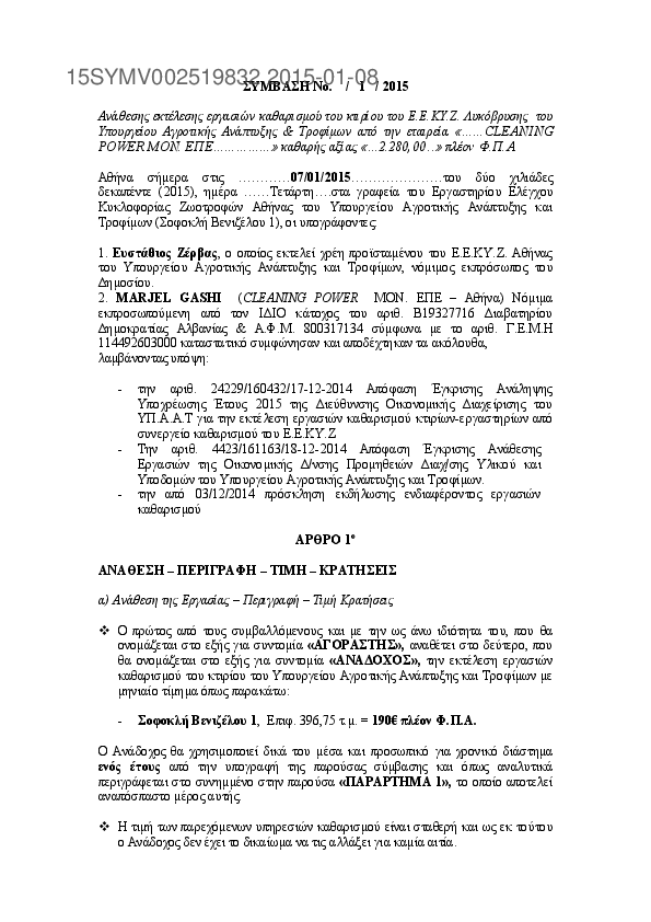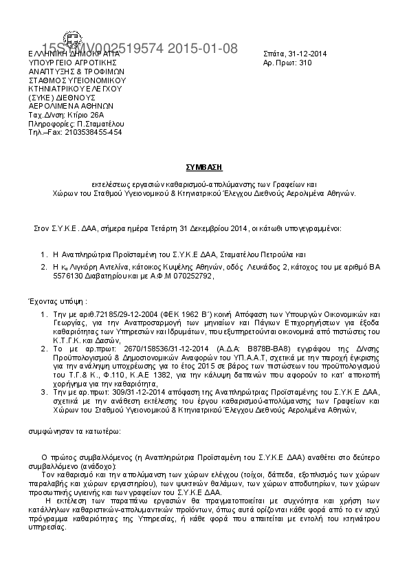 1. ΣΥΜΒΑΣΗ ΚΑΘΑΡΙΟΤΗΤΑΣ ΚΑΙ ΑΠΟΛΥΜΑΝΣΗΣ ΤΩΝ ΧΩΡΩΝ ΤΟΥ ΣΥΚΕ ΕΥΖΩΝΩΝ-ΕΙΔΟΜΕΝΗΣ ΓΙΑ ΤΟ ΕΤΟΣ 2015