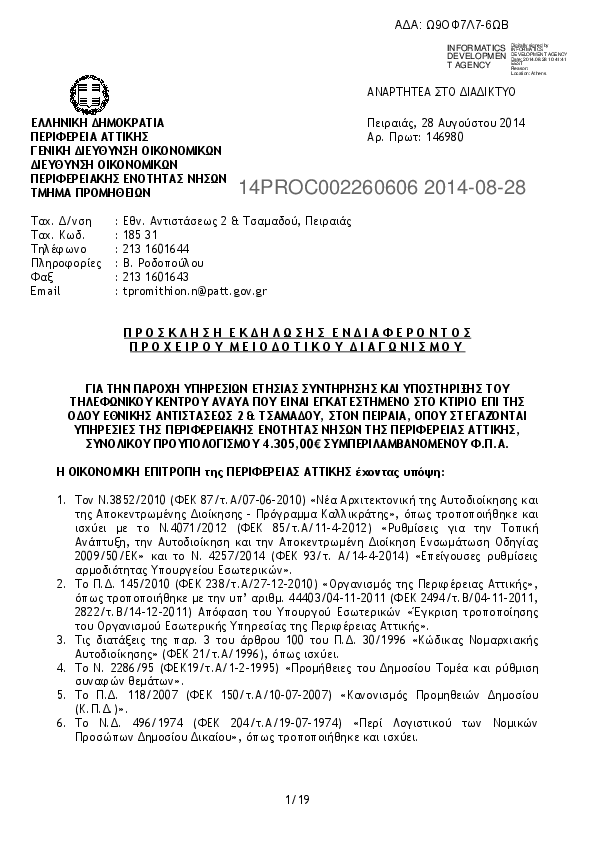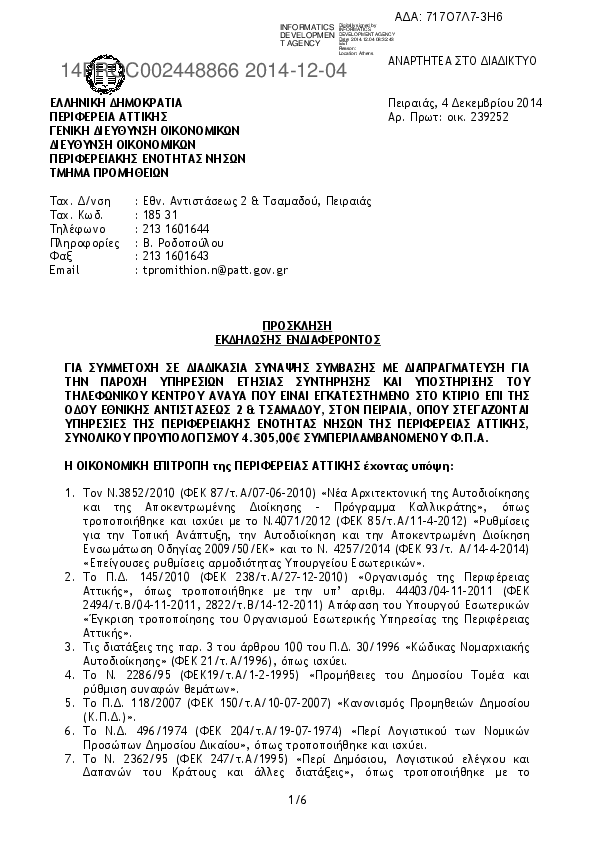 8. ΠΡΟΣΚΛΗΣΗ ΕΚΔΗΛΩΣΗΣ ΕΝΔΙΑΦΕΡΟΝΤΟΣΓΙΑ ΣΥΜΜΕΤΟΧΗ ΣΕ ΔΙΑΔΙΚΑΣΙΑ ΣΥΝΑΨΗΣ ΣΥΜΒΑΣΗΣ ΜΕ ΔΙΑΠΡΑΓΜΑΤΕΥΣΗ ΓΙΑ ΤΗΝ ΠΑΡΟΧΗ ΥΠΗΡΕΣΙΩΝ ΕΤΗΣΙΑΣ ΣΥΝΤΗΡΗΣΗΣ ΚΑΙ ΥΠΟΣΤΗΡΙΞΗΣ ΤΟΥ ΤΗΛΕΦΩΝΙΚΟΥ ΚΕΝΤΡΟΥ AVAYA ΠΟΥ ΕΙΝΑΙ ΕΓΚΑΤΕΣΤΗΜΕΝΟ ΣΤΟ ΚΤΙΡΙΟ ΕΠΙ ΤΗΣ ΟΔΟΥ ΕΘΝ...