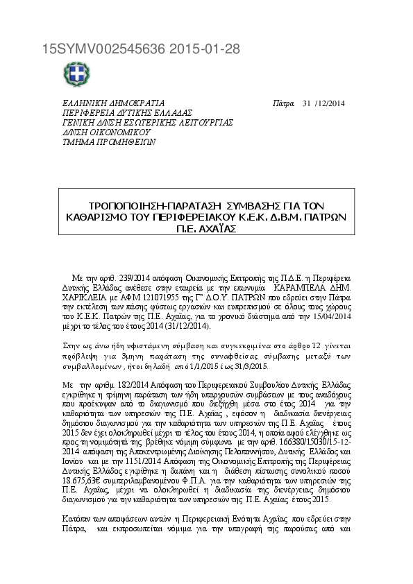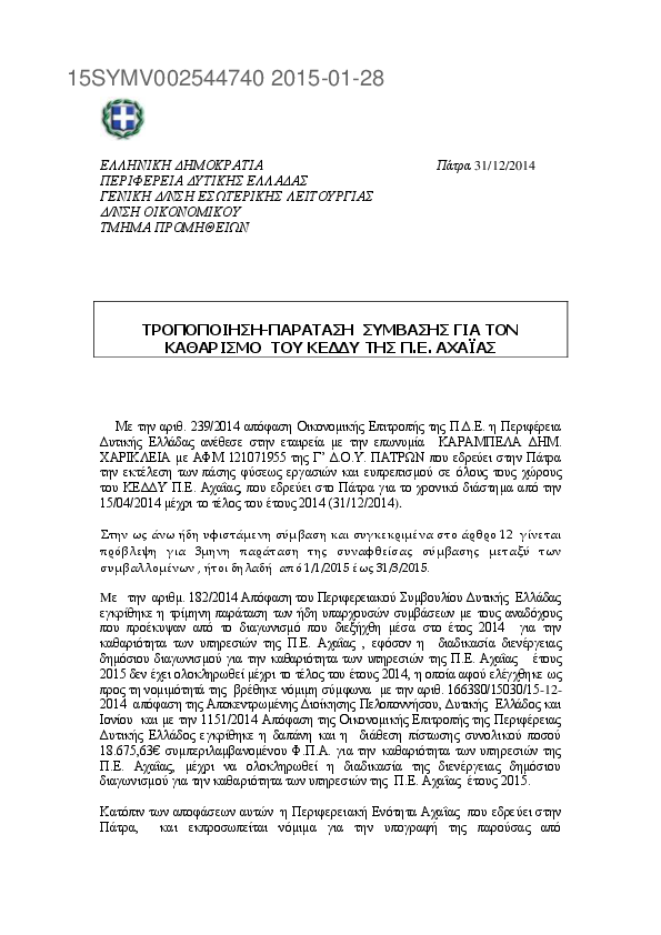 1. ΠΑΡΑΤΑΣΗ ΣΥΜΒΑΣΗΣ ΕΤΟΥΣ 2014 ΓΙΑ ΤΟΝ ΚΑΘΑΡΙΣΜΟ ΤΟΥ ΚΕΔΔΥ ΤΗΣ Π.Ε. ΑΧΑΙΑΣ
