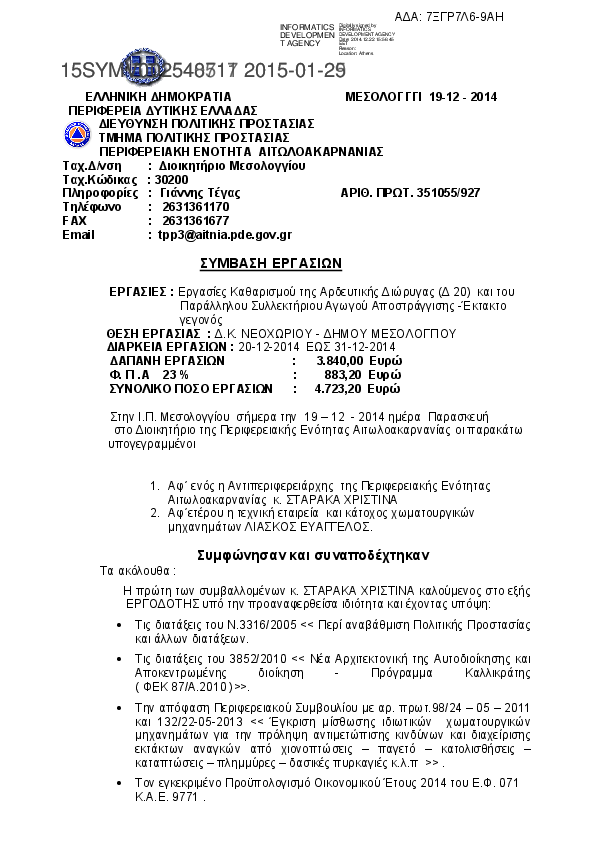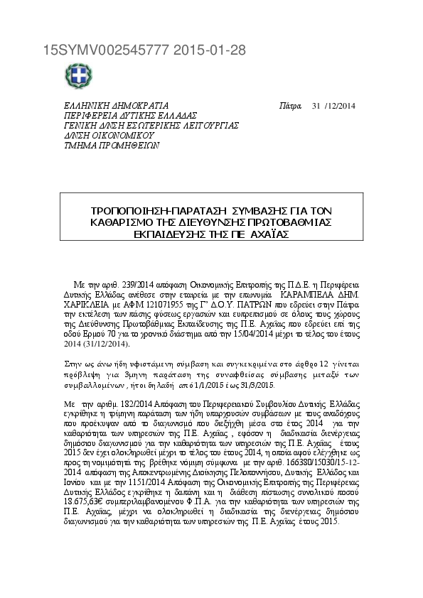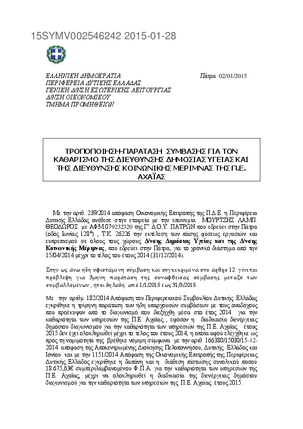 2. ΠΑΡΑΤΑΣΗ ΣΥΜΒΑΣΗΣ ΕΤΟΥΣ 2014 ΓΙΑ ΤΟΝ ΚΑΘΑΡΙΣΜΟ ΤΟΥ ΚΤΙΡΙΟΥ ΜΗΧΑΝΟΛΟΓΙΚΟΥ ΕΞΟΠΛΙΣΜΟΥ Π.Ε. ΑΧΑΙΑΣ