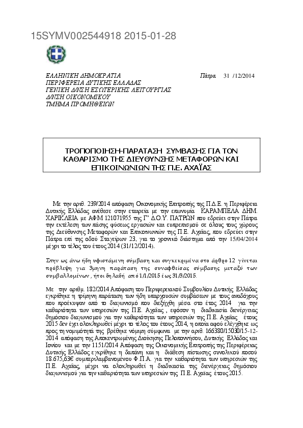 4. ΠΑΡΑΤΑΣΗ ΣΥΜΒΑΣΗΣ ΕΤΟΥΣ 2014 ΓΙΑ ΤΟΝ ΚΑΘΑΡΙΣΜΟ ΤΗΣ Δ/ΣΗΣ ΜΕΤΑΦΟΡΩΝ & ΕΠΙΚΟΙΝΩΝΙΩΝ ΤΗΣ Π.Ε. ΑΧΑΙΑΣ