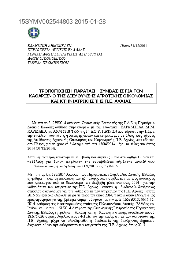 5. ΠΑΡΑΤΑΣΗ ΣΥΜΒΑΣΗΣ ΕΤΟΥΣ 2014 ΓΙΑ ΤΟΝ ΚΑΘΑΡΙΣΜΟ ΤΗΣ Δ/ΣΗΣ ΑΓΡ. ΟΙΚΟΝΟΜΙΑΣ & ΚΤΗΝ/ΚΗΣ ΤΗΣ Π.Ε. ΑΧΑΙΑΣ