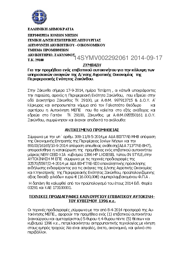 6. ΣΥΜΒΑΣΗ ΠΡΟΜΗΘΕΙΑΣ ΕΠΙΒΑΤΙΚΟΥ ΑΥΤΟΚΙΝΗΤΟΥ ΓΙΑ ΤΙΣ ΥΠΗΡΕΣΙΑΚΕΣ ΑΝΑΓΚΕΣ ΤΗΣ Π.Ε. ΖΑΚΥΝΘΟΥ