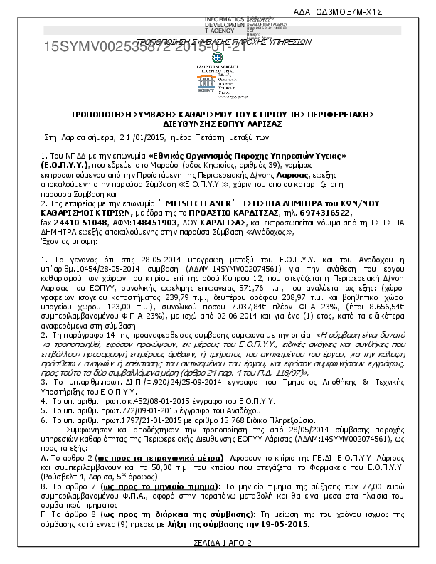 9. ΤΡΟΠΟΠΟΙΗΣΗ ΣΥΜΒΑΣΗΣ ΚΑΘΑΡΙΣΜΟΥ ΤΟΥ ΚΤΙΡΙΟΥ ΤΗΣ ΠΕΡΙΦΕΡΕΙΑΚΗΣ ΔΙΕΥΘΥΝΣΗΣ ΕΟΠΥΥ ΛΑΡΙΣΑΣ
