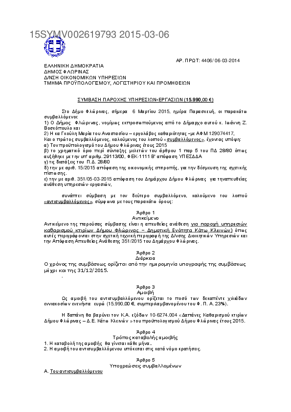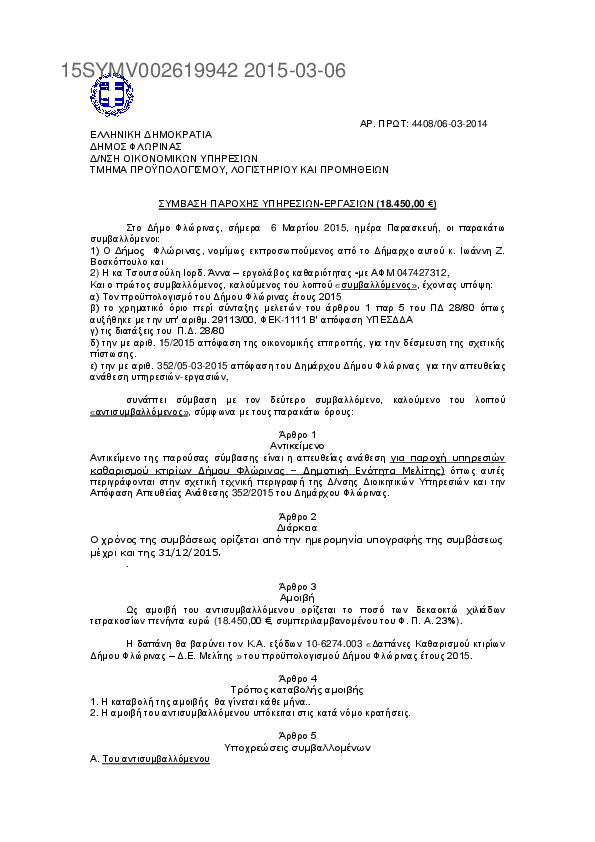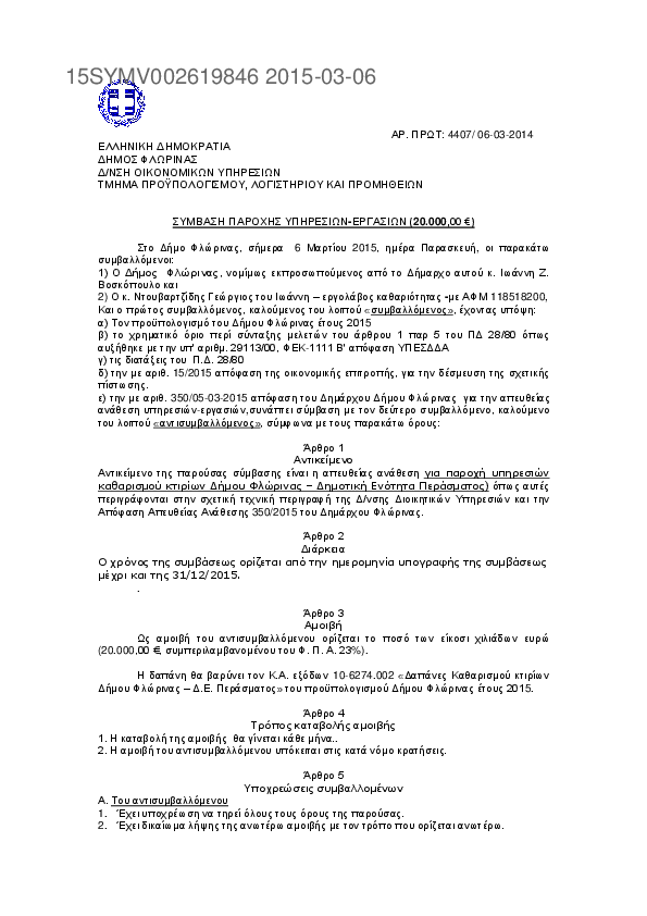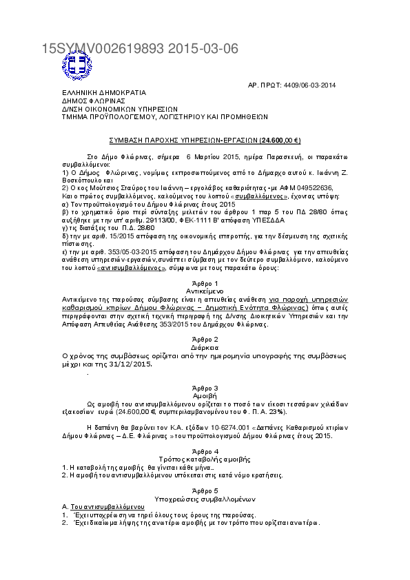 4. Σύμβαση Παροχής Υπηρεσιών για Δαπάνες Καθαρισμού κτιρίων Δήμου Φλώρινας - Δ.Ε. Μελίτης