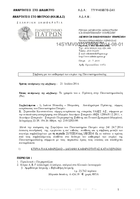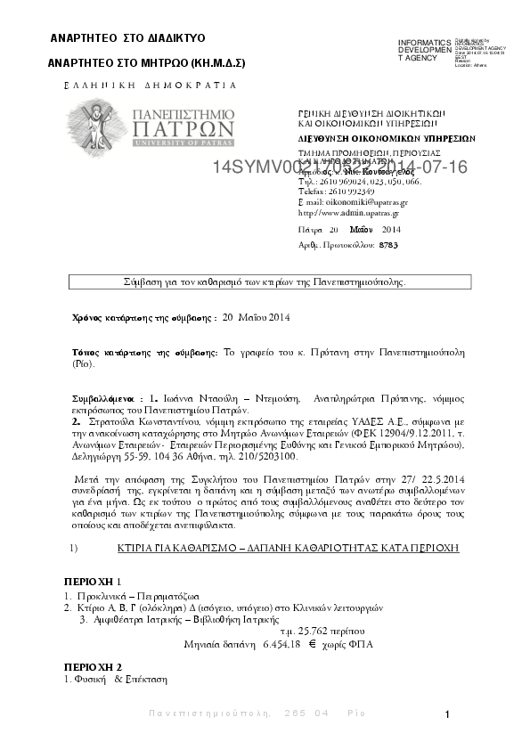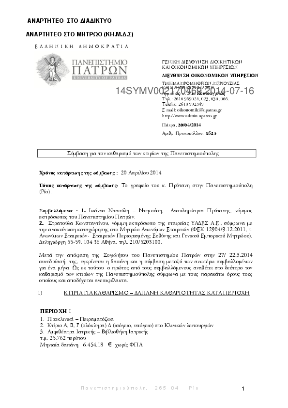 7. ΣΥΜΒΑΣΗ ΓΙΑ ΤΟΝ ΚΑΘΑΡΙΣΜΟ ΤΩΝ ΚΤΙΡΙΩΝ ΤΗΣ ΠΑΝ/ΛΗΣ ΓΙΑ ΤΟ ΔΙΑΣΤΗΜΑ 20/4/2014 - 19/5/2014