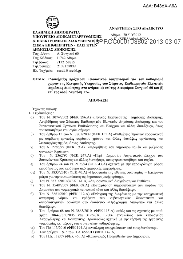 1. Διακήρυξη πρόχειρου μειοδοτικού διαγωνισμού για τον καθαρισμό χώρων της Κεντρικής Υπηρεσίας του ΣΕΕΔΔ