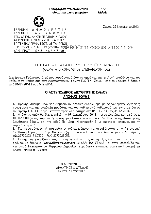 3. ΔΙΑΚΗΡΥΞΗ ΥΠ’ΑΡΙΘΜ. 8Α/2013 Παροχή υπηρεσιών καθαριότητας στις κτιριακές εγκαταστάσεις στέγασης της Αστυνομικής Διεύθυνσης Αλεξανδρούπολης, του Αστυνομικού Τμήματος Σαμοθράκης, του Αστυνομικού Τμήματος Φερών, του Αστυνομικού Τμήματος Τυχ...