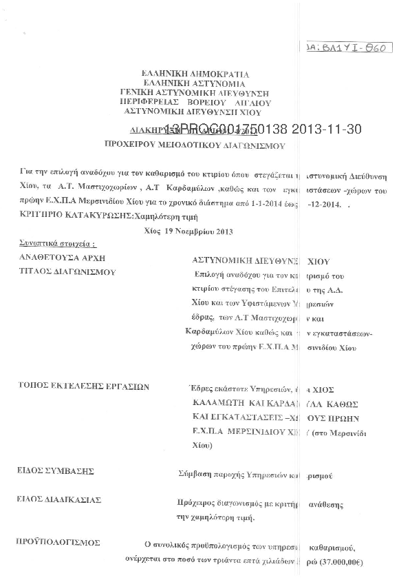 8. ΔΙΑΚΗΡΥΞΗ ΠΡΟΧΕΙΡΟΥ ΜΕΙΟΔΟΤΙΚΟΥ ΔΙΑΓΩΝΙΣΜΟΥ ΓΙΑ ΤΟΝ ΚΑΘΑΡΙΣΜΟ ΤΟΥ ΚΤΙΡΙΟΥ ΟΠΟΥ ΣΤΕΓΑΖΕΤΑΙ Η ΑΣΤΥΝΟΜΙΚΗ ΔΙΕΥΘΥΝΣΗ ΧΙΟΥ ,ΤΑ Α.Τ ΜΑΣΤΙΧΟΧΩΡΙΩΝ , Α.Τ ΚΑΡΔΑΜΥΛΩΝ , ΚΑΘΩΣ ΚΑΙ ΤΩΝ ΕΓΚΑΤΑΣΤΑΣΕΩΝ