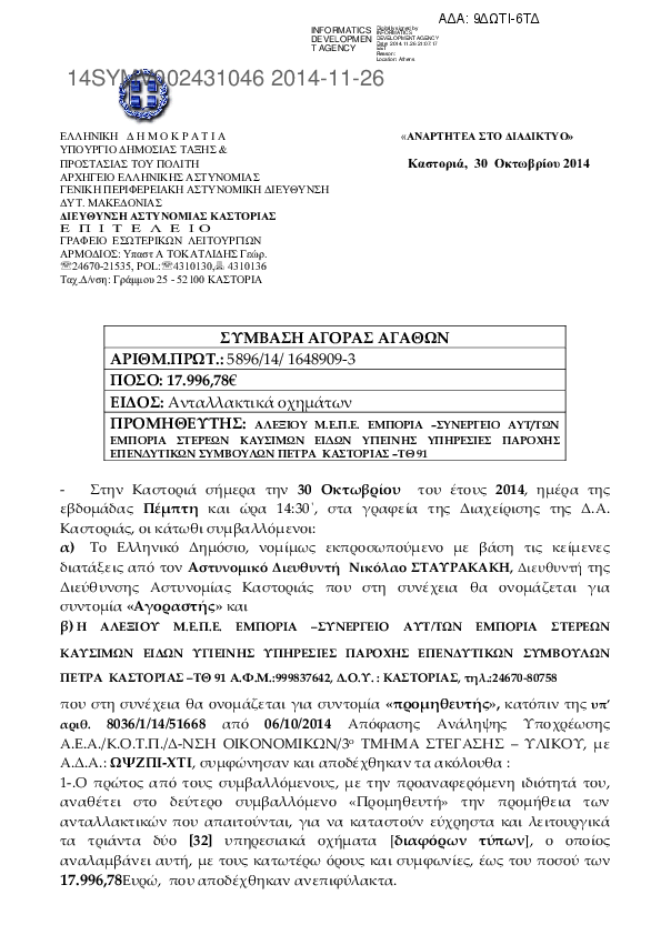 4. ΣΥΜΒΑΣΗ ΑΓΟΡΑΣ ΑΝΤΑΛΛΑΚΤΙΚΩΝ ΥΠΗΡΕΣΙΑΚΩΝ ΟΧΗΜΑΤΩΝ Δ.Α.ΚΑΣΤΟΡΙΑΣ