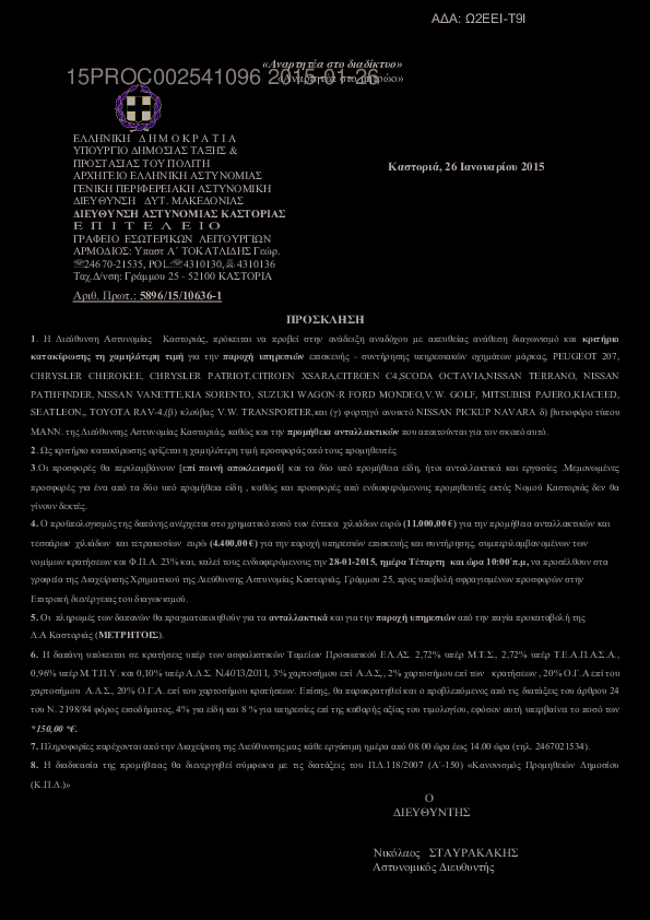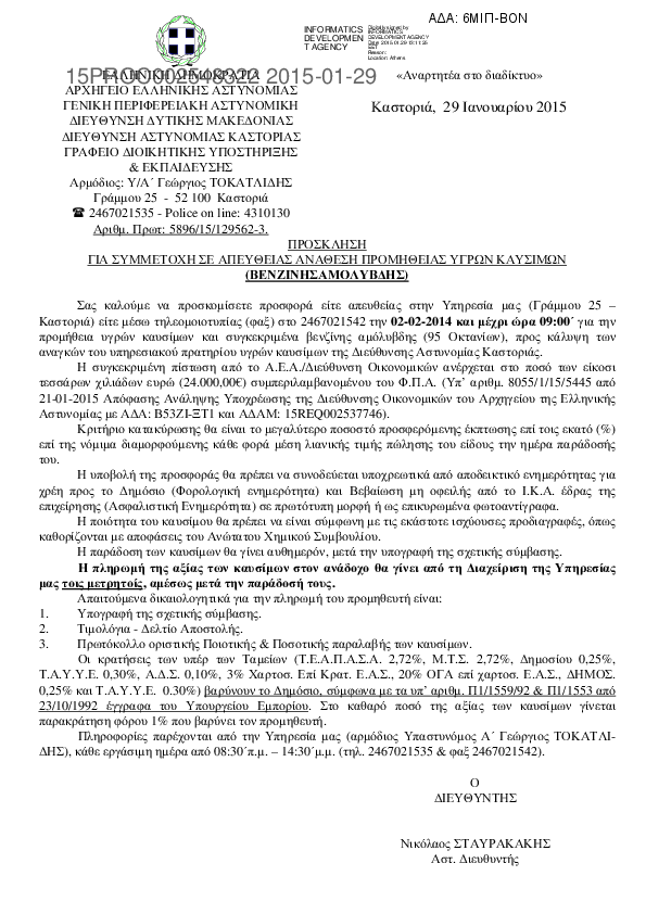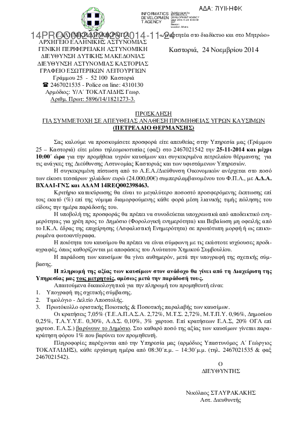 2. Πρόσκληση για συμμετοχή σε απευθείας ανάθεση προμηθειας υγρών καυσίμων (πετρέλαιο θέρμανσης) προς κάλυψη των αναγκών της Δ/νσης Αστυνομίας Καστοριάς.