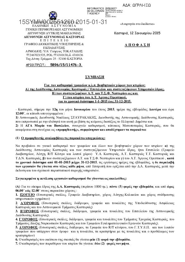 10. Σύμβαση καθαριότητας οικημάτων που στεγάζονται οι Υπηρεσίες της Δ.Α. Καστοριάς έτους 2015.