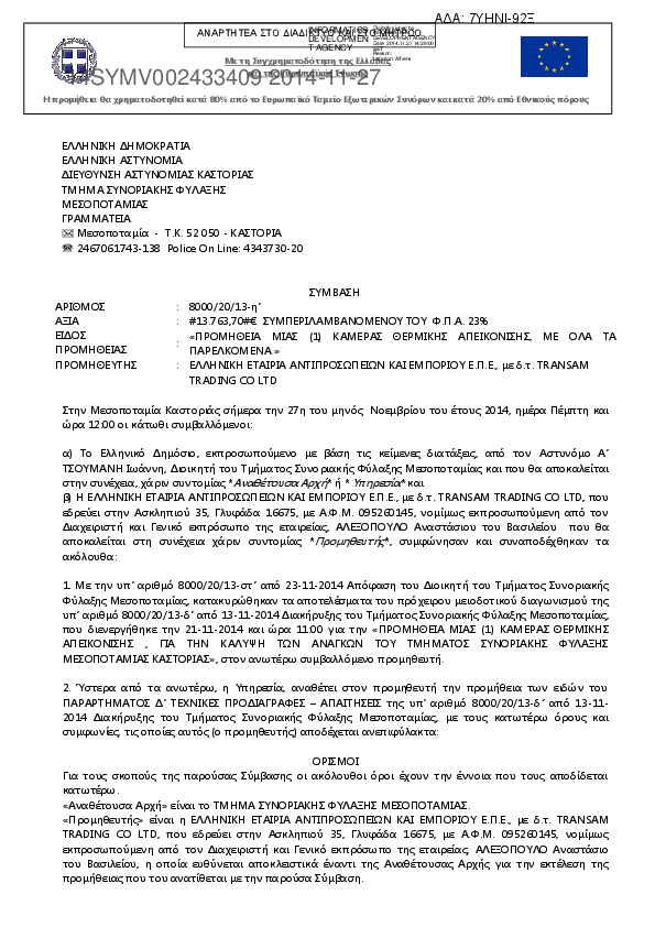6. Σύμβαση για την προμήθεια μιας (1) κάμερας θερμικής απεικόνισης, του ΤΣΦ Μεσοποταμίας Καστοριάς