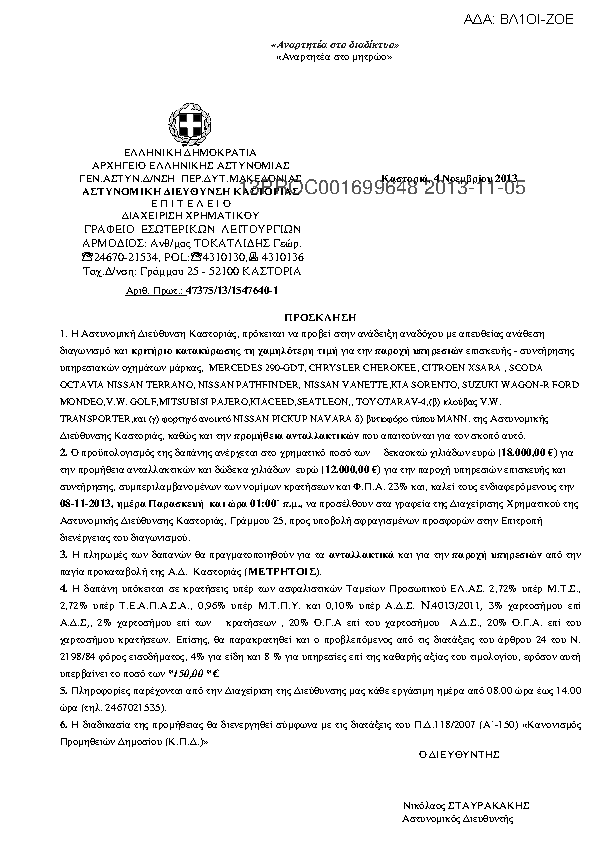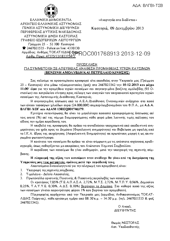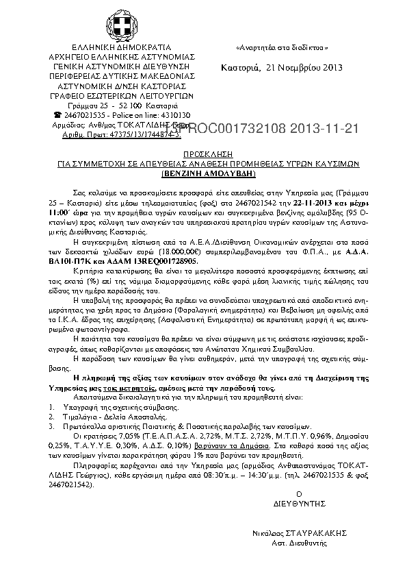 1. Πρόσκληση για συμμετοχή σε απευθείας ανάθεση προμήθειας υγρών καυσίμων κίνησης της Α.Δ. Καστοριάς