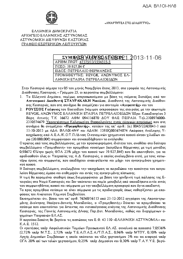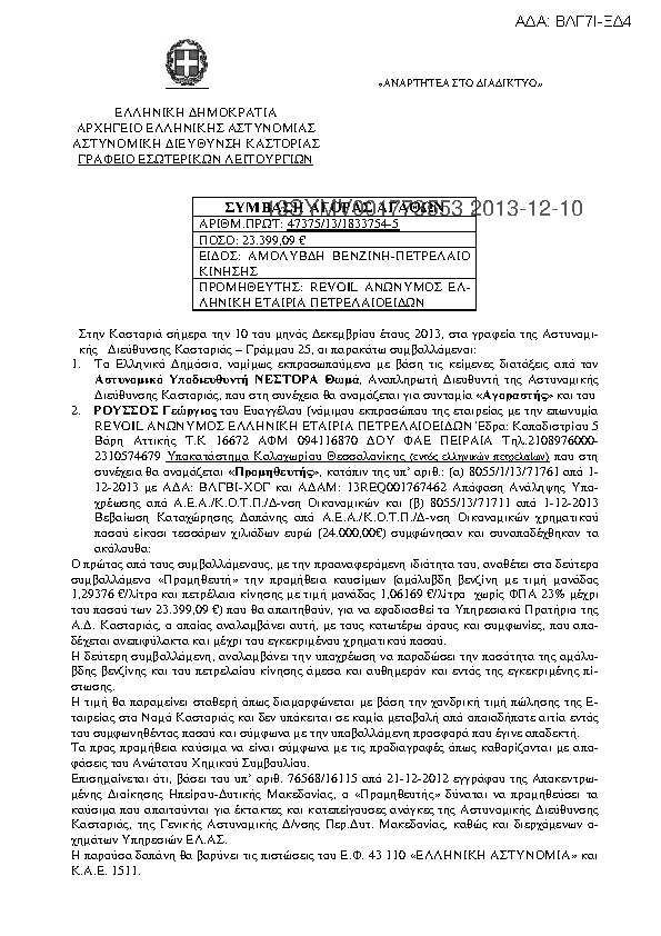 9. Σύμβαση για την προμήθεια αμόλυβδης βενζίνης προς κάλυψη των αναγκών της Α.Δ. Καστοριάς.