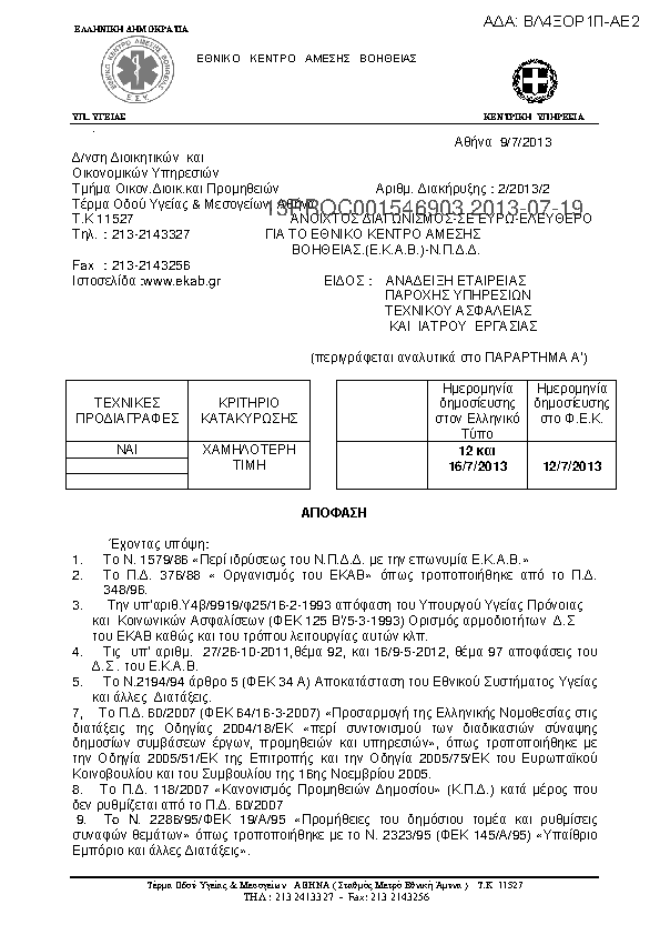 7. ΑΝΑΔΕΙΞΗ ΕΤΑΙΡΕΙΑΣ ΠΑΡΟΧΗΣ ΥΠΗΡΕΣΙΩΝ ΤΕΧΝΙΚΟΥ ΑΣΦΑΛΕΙΑΣ ΚΑΙ ΙΑΤΡΟΥ ΕΡΓΑΣΙΑΣ