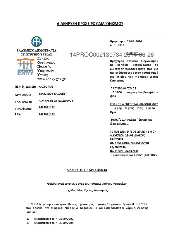 5. ΔΙΑΚΗΡΥΞΗ 3/2014 ΓΙΑ ΑΝΑΘΕΣΗ ΤΩΝ ΕΡΓΑΣΙΩΝ ΚΑΘΑΡΙΣΜΟΥ ΤΟΥ ΚΤΙΡΙΟΥ ΤΗΣ ΜΟΝΑΔΑΣ ΥΓΕΙΑΣ-ΠΕΔΥ ΚΑΣΤΟΡΙΑΣ