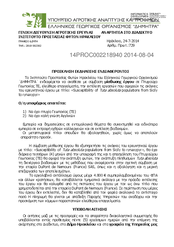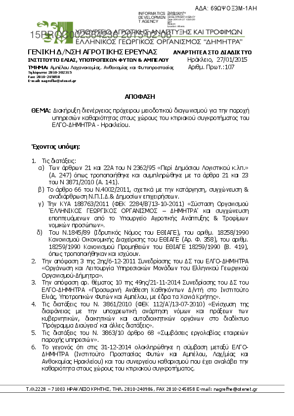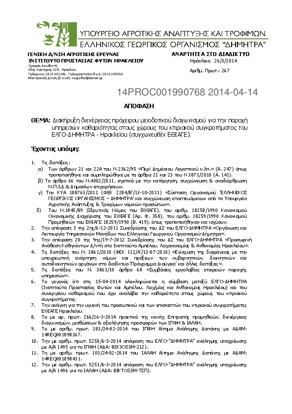 2. Διακήρυξη διενέργειας πρόχειρου μειοδοτικού διαγωνισμού για την παροχή υπηρεσιών καθαριότητας στους χώρους του κτιριακού συγκροτήματος του ΕΛΓΟ-ΔΗΜΗΤΡΑ - Ηρακλείου (συγχωνευθέν ΕΘΙΑΓΕ).