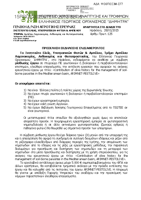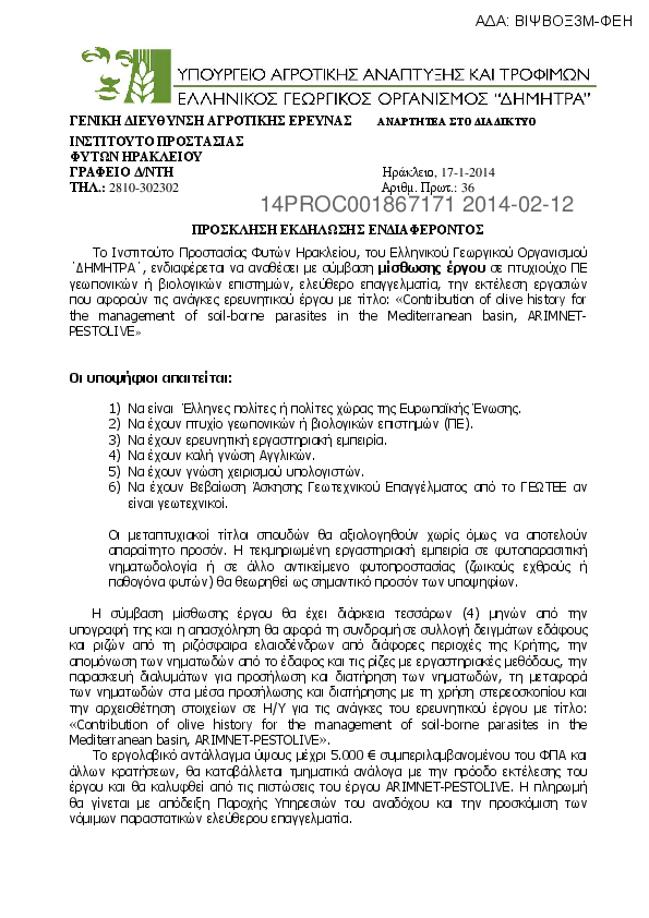 10. ΠΡΟΣΚΛΗΣΗ ΕΚΔΗΛΩΣΗΣ ΕΝΔΙΑΦΕΡΟΝΤΟΣ (για τις αναγκες του προγράμματος ARIMNET-PESTOLIVE)