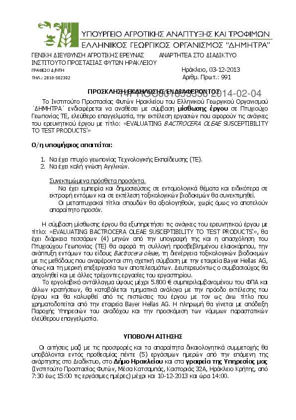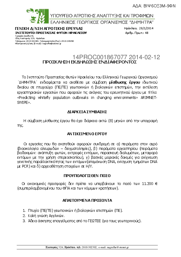 8. Διακήρυξη διενέργειας πρόχειρου μειοδοτικού διαγωνισμού για την παροχή υπηρεσιών καθαριότητας στους χώρους του κτιριακού συγκροτήματος του ΕΛΓΟ-ΔΗΜΗΤΡΑ - Ηρακλείου (συγχωνευθέν ΕΘΙΑΓΕ).