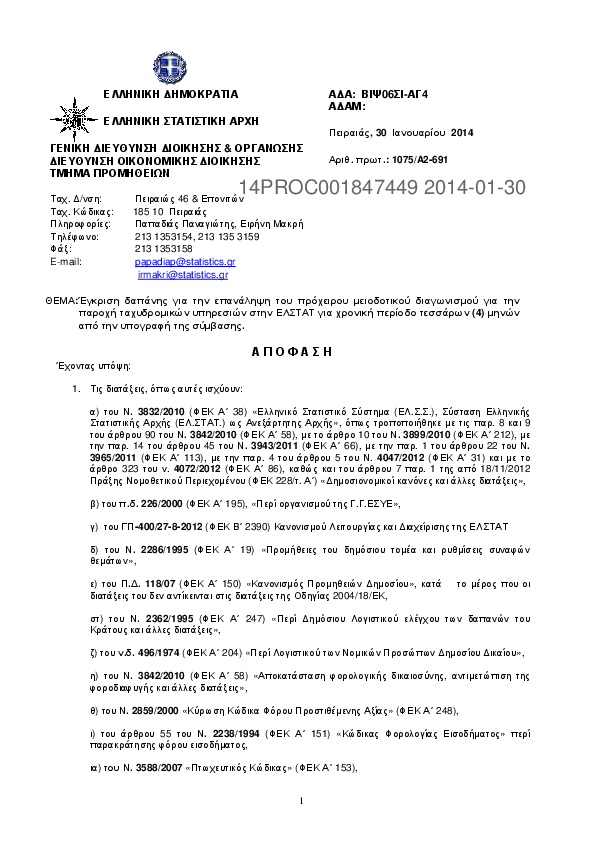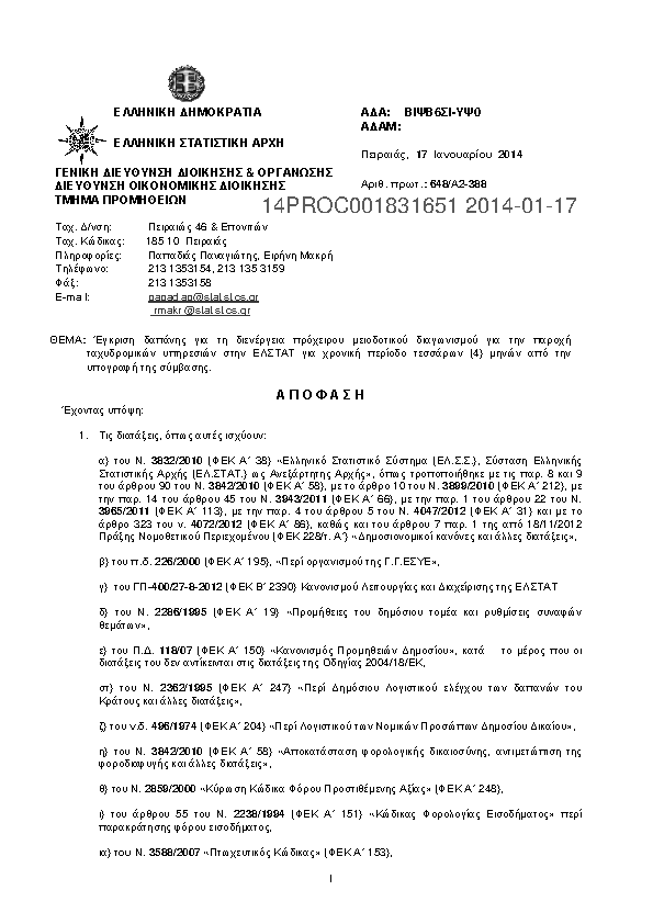 1. Έγκριση δαπάνης για τη διενέργεια πρόχειρου μειοδοτικού διαγωνισμού για την παροχή ταχυδρομικών υπηρεσιών στην ΕΛΣΤΑΤ για χρονική περίοδο τεσσάρων (4) μηνών από την υπογραφή της σύμβασης.
