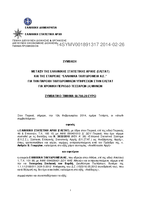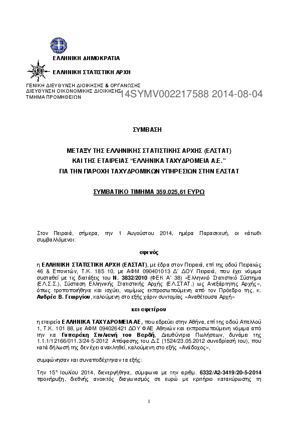 4. Διεθνής ανοικτός διαγωνισμός με σφραγισμένες προσφορές, με κριτήριο κατακύρωσης τη χαμηλότερη τιμή, για το Έργο «ΠΑΡΟΧΗ ΤΑΧΥΔΡΟΜΙΚΩΝ ΥΠΗΡΕΣΙΩΝ ΣΤΗΝ ΕΛΛΗΝΙΚΗ ΣΤΑΤΙΣΤΙΚΗ ΑΡΧΗ (ΕΛΣΤΑΤ)»