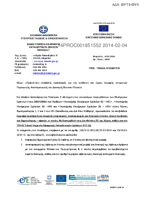 1. ΠΡΟΣΚΛΗΣΗ ΥΠΟΒΟΛΗΣ ΠΡΟΣΦΟΡΑΣ ΓΙΑ ΠΑΡΟΧΗ ΥΠΗΡΕΣΙΩΝ ΠΑΡΑΓΩΓΗΣ, ΑΝΑΠΑΡΑΓΩΓΗΣ& ΔΙΑΝΟΜΗΣ ΕΝΤΥΠΟΥ ΥΛΙΚΟΥ