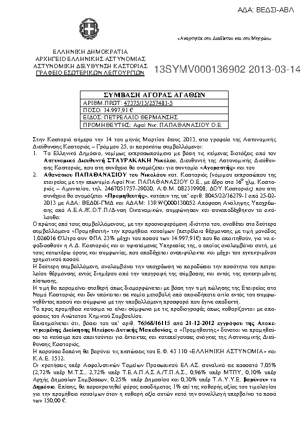 6. Προμήθεια πετρελαίου θέρμανσης από το ελεύθερο εμπόριο προς κάλυψη των αναγκών της Α.Δ. Καστοριάς.