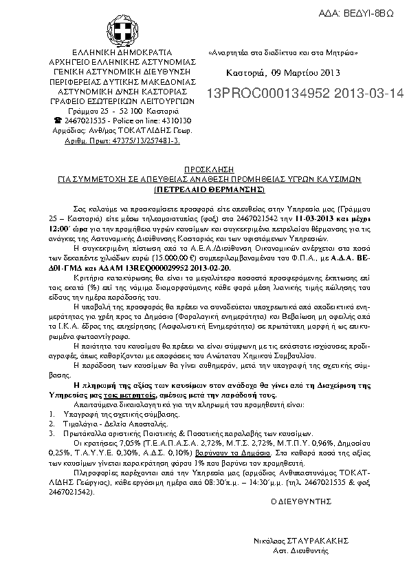 3. ΠΡΟΣΚΛΗΣΗ ΓΙΑ ΣΥΜΜΕΤΟΧΗ ΣΕ ΑΠΕΥΘΕΙΑΣ ΑΝΑΘΕΣΗ ΠΡΟΜΗΘΕΙΑΣ ΥΓΡΩΝ ΚΑΥΣΙΜΩΝ (ΠΕΤΡΕΛΑΙΟ ΘΕΡΜΑΝΣΗΣ) ΠΡΟΣ ΚΑΛΥΨΗ ΤΩΝ ΑΝΑΓΚΩΝ ΤΗΣ ΑΔ ΚΑΣΤΟΡΙΑΣ.
