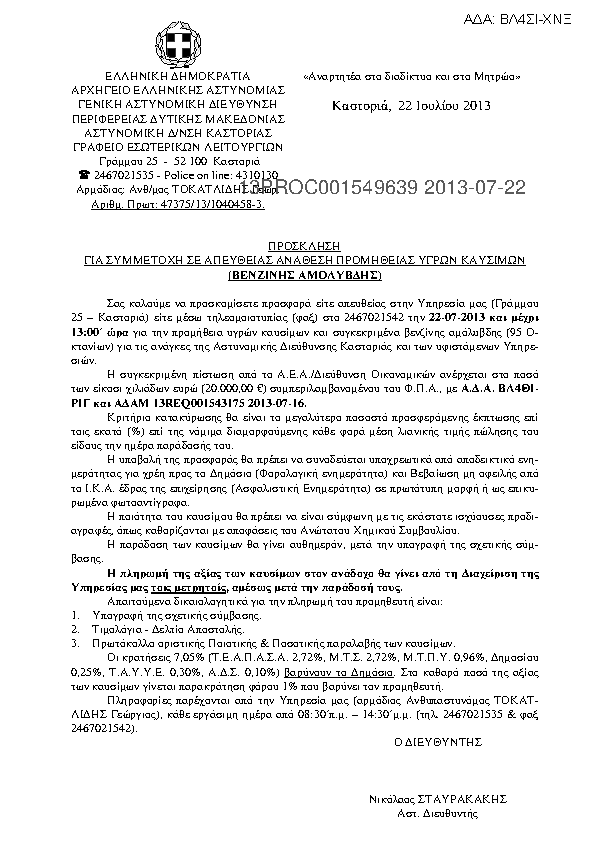 5. ΠΡΟΣΚΛΗΣΗ ΓΙΑ ΣΥΜΜΕΤΟΧΗ ΣΕ ΑΠΕΥΘΕΙΑΣ ΑΝΑΘΕΣΗ ΠΡΟΜΗΘΕΙΑΣ ΥΓΡΩΝ ΚΑΥΣΙΜΩΝ (ΒΕΝΖΙΝΗΣ ΑΜΟΛΥΒΔΗΣ) ΠΡΟΣ ΚΑΛΥΨΗ ΤΩΝ ΑΝΑΓΚΩΝ ΤΗΣ ΑΣΤΥΝΟΜΙΚΗΣ ΔΙΕΥΘΥΝΣΗΣ ΚΑΣΤΟΡΙΑΣ.
