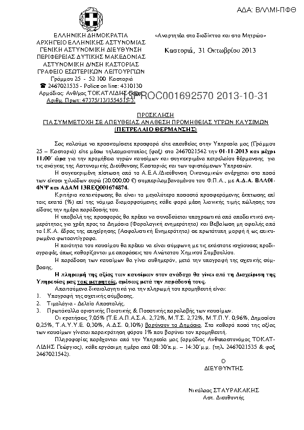 3. ΠΡΟΣΚΛΗΣΗ ΓΙΑ ΣΥΜΜΕΤΟΧΗ ΣΕ ΑΠΕΥΘΕΙΑΣ ΑΝΑΘΕΣΗ ΠΡΟΜΗΘΕΙΑΣ ΥΓΡΩΝ ΚΑΥΣΙΜΩΝ (ΠΕΤΡΕΛΑΙΟ ΘΕΡΜΑΝΣΗΣ) ΠΡΟΣ ΚΑΛΥΨΗ ΤΩΝ ΑΝΑΓΚΩΝ ΤΗΣ Α.Δ. ΚΑΣΤΟΡΙΑΣ.