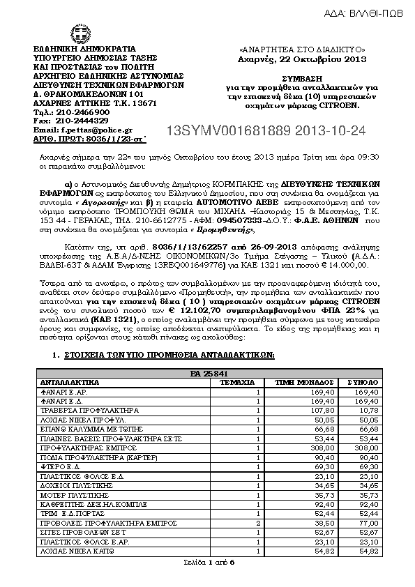 9. ΣΥΜΒΑΣΗ για την προμήθεια ανταλλακτικών για την επισκευή δέκα (10) υπηρεσιακών οχημάτων μάρκας CITRO