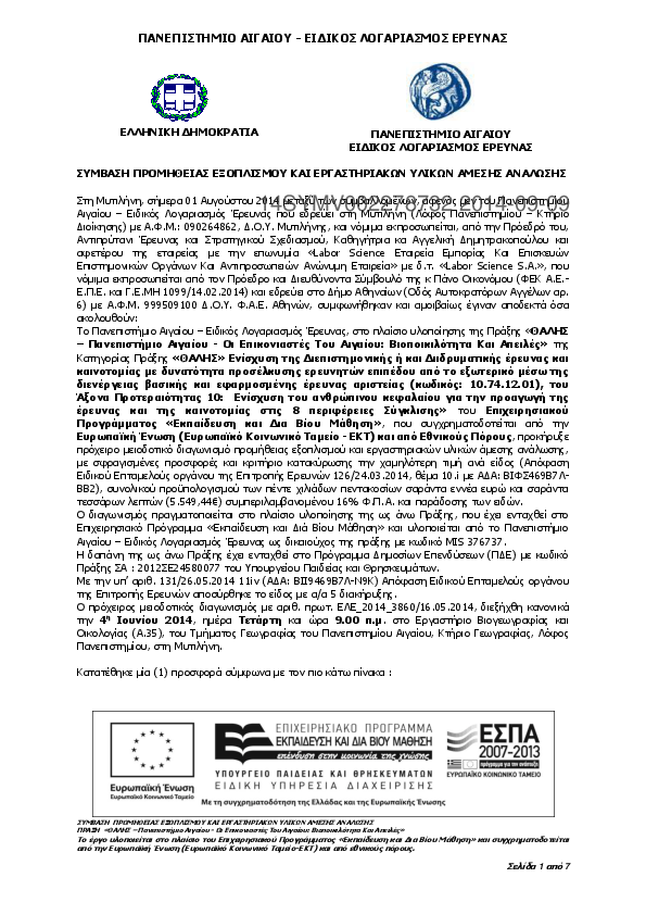 1. ΣΥΜΒΑΣΗ ΠΡΟΜΗΘΕΙΑΣ ΕΞΟΠΛΙΣΜΟΥ ΚΑΙ ΕΡΓΑΣΤΗΡΙΑΚΩΝ ΥΛΙΚΩΝ ΑΜΕΣΗΣ ΑΝΑΛΩΣΗΣ