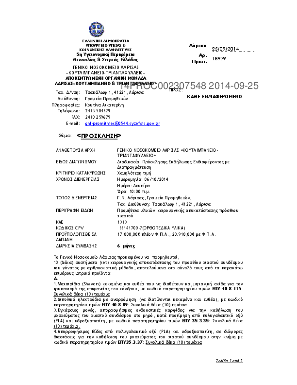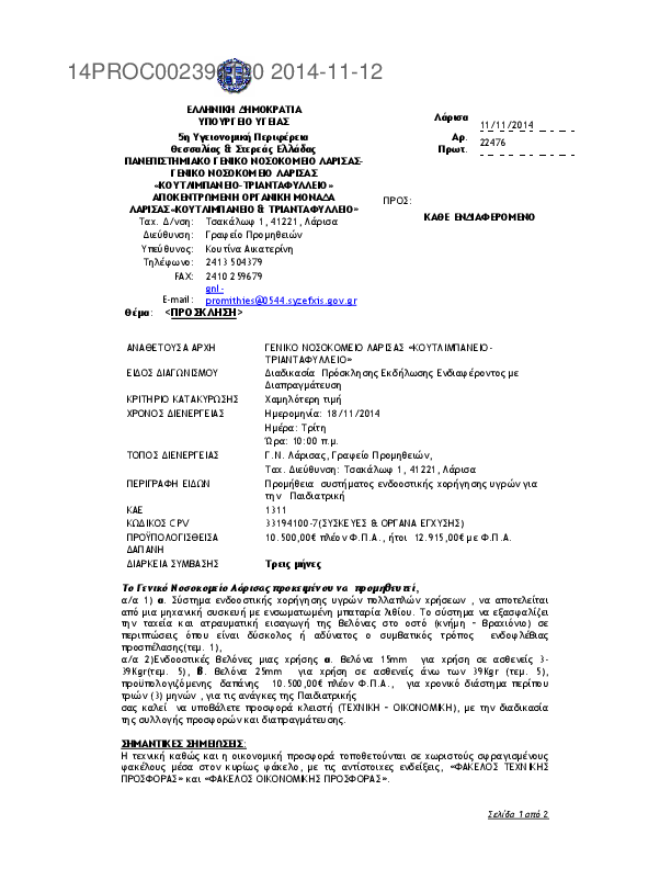 2. ΔΙΑΚΗΡΥΞΗ 15/2014 ΓΙΑ ΤΗΝ ΠΡΟΜΗΘΕΙΑ ΣΑΚΩΝ ΑΙΜΑΤΟΣ-ΠΡΟΜΗΘΕΙΕΣ ΜΕΤΑΓΓΙΣΗΣ ΑΙΜΑΤΟΣ