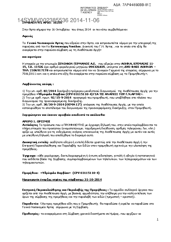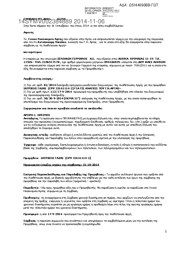 1. ΣΥΜΒΑΣΗ ΓΙΑ ΠΡΟΜΗΘΕΙΑ ΙΑΤΡΙΚΗΣ ΓΑΖΑΣ Γ.Ν. ΑΡΤΑΣ