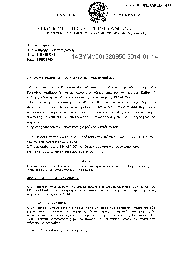 9. ΣΥΜΒΑΣΗ ΣΥΝΤΗΡΗΣΗΣ ΤΟΥ ΚΕΝΤΡΙΚΟΥ UPS ΤΗΣ ΠΤΕΡΥΓΑΣ ΑΝΤΩΝΙΑΔΟΥ ΤΟΥ ΠΑΝΕΠΙΣΤΗΜΙΟΥ ΓΙΑ ΤΟ ΕΤΟΣ 2014