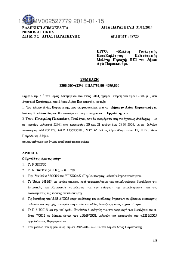 1. «ΜΕΛΕΤΗ ΓΕΩΛΟΓΙΚΗΣ ΚΑΤΑΛΛΗΛΟΤΗΤΑΣ ΠΕΡΙΟΧΗΣ ΠΕ3 ΤΟΥ ΔΗΜΟΥ ΑΓΙΑΣ ΠΑΡΑΣΚΕΥΗΣ»