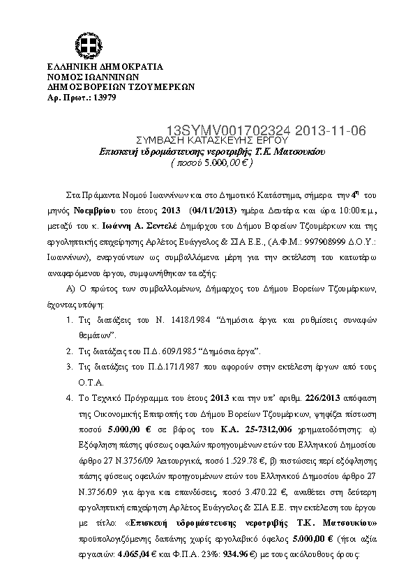 1. Αντικατάσταση τμήματος δικτύου ύδρευσης Τ.Κ. Καλαρρυτών