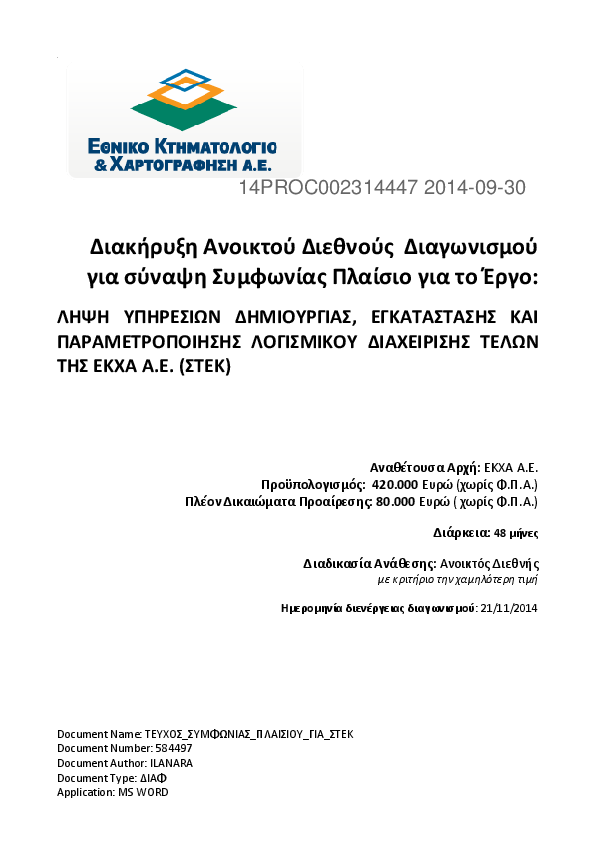 1. ΔΙΑΚΗΡΥΞΗ ΑΝΟΙΚΤΟΥ ΔΙΕΘΝΟΥΣ ΔΙΑΓΩΝΙΣΜΟΥ ΓΙΑ ΣΥΜΦΩΝΙΑ ΠΛΑΙΣΙΟ ΓΙΑ ΛΗΨΗ ΛΟΓΙΣΜΙΚΟΥ ΔΙΑΧΕΙΡΙΣΗΣ ΤΕΛΩΝ
