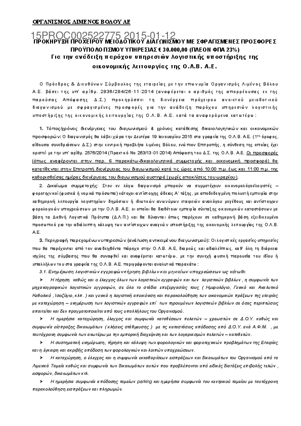 1. ΠΡΟΚΗΡΥΞΗ ΠΡΟΧΕΙΡΟΥ ΜΕΙΟΔΟΤΙΚΟΥ ΔΙΑΓΩΝΙΣΜΟΥ ΜΕ ΣΦΡΑΓΙΣΜΕΝΕΣ ΠΡΟΣΦΟΡΕΣ ΠΡΟΫΠΟΛΟΓΙΣΜΟΥ ΥΠΗΡΕΣΙΑΣ € 30.000,00 (ΠΛΕΟΝ ΦΠΑ 23%)Για την ανάδειξη παρόχου υπηρεσιών λογιστικής υποστήριξης της οικονομικής λειτουργίας της Ο.Λ.Β. Α.Ε.