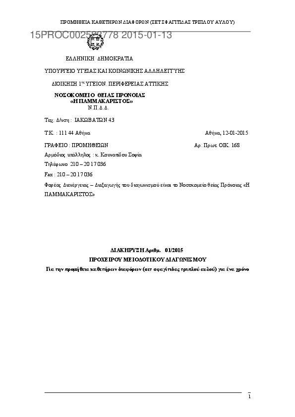 1. Διακήρυξη αριθμ. 01/2015 πρόχειρου μειοδοτικού διαγωνισμού για την προμήθεια καθετήρων διαφόρων (σετ σφαγίτιδας τριπλού αυλού)