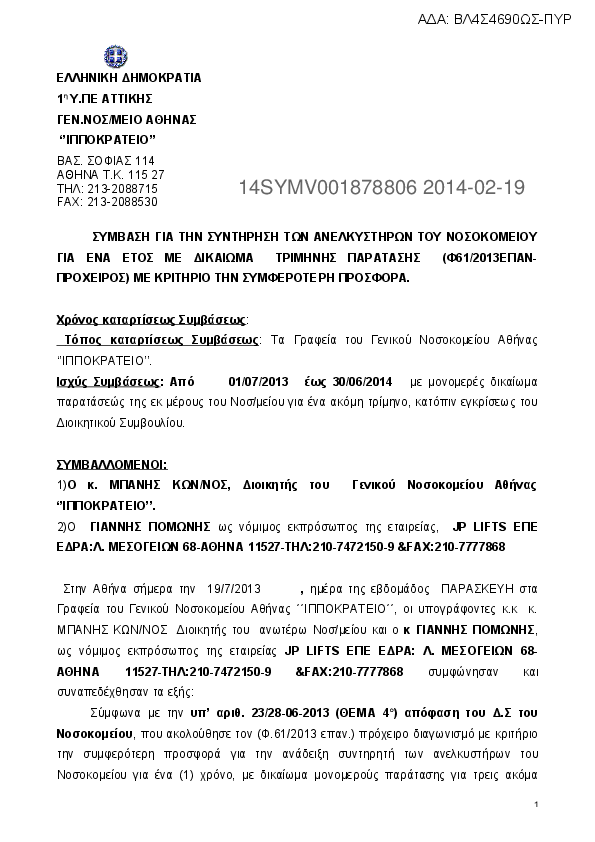 1. ΣΥΜΒΑΣΗ ΓΙΑ ΤΗΝ ΣΥΝΤΗΡΗΣΗ ΤΩΝ ΑΝΕΛΚΥΣΤΗΡΩΝ ΤΟΥ ΝΟΣΟΚΟΜΕΙΟΥ ΓΙΑ ΕΝΑ ΕΤΟΣ