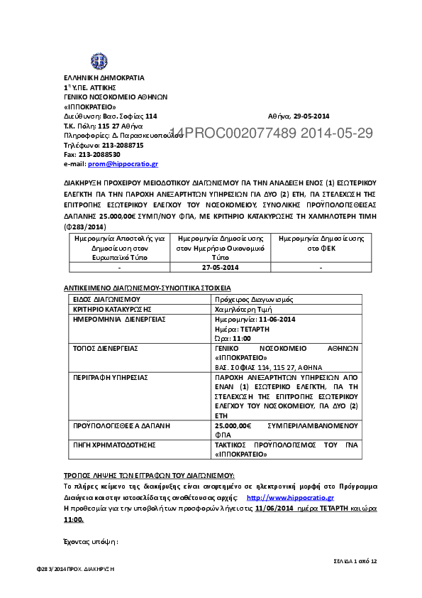 3. ΔΙΑΚΗΡΥΞΗ ΠΡΟΧΕΙΡΟΥ ΜΕΙΟΔΟΤΙΚΟΥ ΔΙΑΓΩΝΙΣΜΟΥ ΓΙΑ ΤΗΝ ΑΝΑΔΕΙΞΗ ΕΝΟΣ (1) ΕΣΩΤΕΡΙΚΟΥ ΕΛΕΓΚΤΗ ΓΙΑ ΤΗΝ ΠΑΡΟΧΗ ΑΝΕΞΑΡΤΗΤΩΝ ΥΠΗΡΕΣΙΩΝ ΓΙΑ ΔΥΟ (2) ΕΤΗ, ΓΙΑ ΣΤΕΛΕΧΩΣΗ ΤΗΣ ΕΠΙΤΡΟΠΗΣ ΕΣΩΤΕΡΙΚΟΥ ΕΛΕΓΧΟΥ ΤΟΥ ΝΟΣΟΚΟΜΕΙΟΥ, ΣΥΝΟΛΙΚΗΣ ΠΡΟΫΠΟΛΟΓΙΣΘΕΙΣΑΣ ΔΑ...